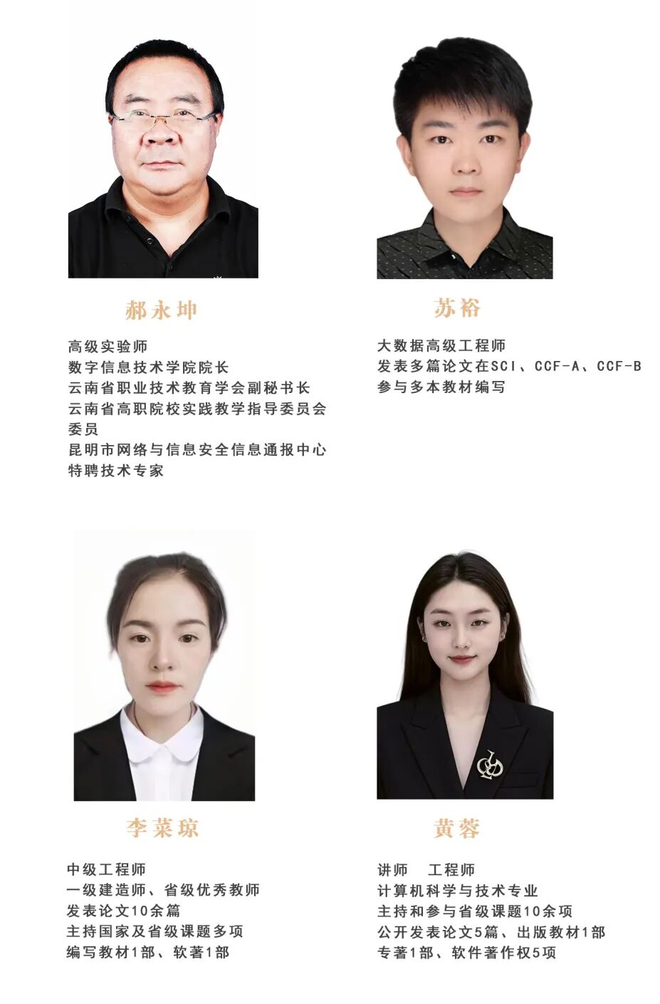 学院汇聚了一支由资深专家与青年才俊组成的教师团队,他们不仅精通软件技术的深厚理论,更具备丰富的实践经验。团队中,学院高级职称3人,研究生以上学历比例40%,双师型教师比例60%以上。充分彰显了教师队伍的专业性与实践性。此外,我们还聘请了5名来自企业的兼职教师,进一步丰富了项目和案例教学资源。学院秉承以学生为中心的教学理念,致力于通过高职称、高学历师资团队,不断提升学生培养水平。