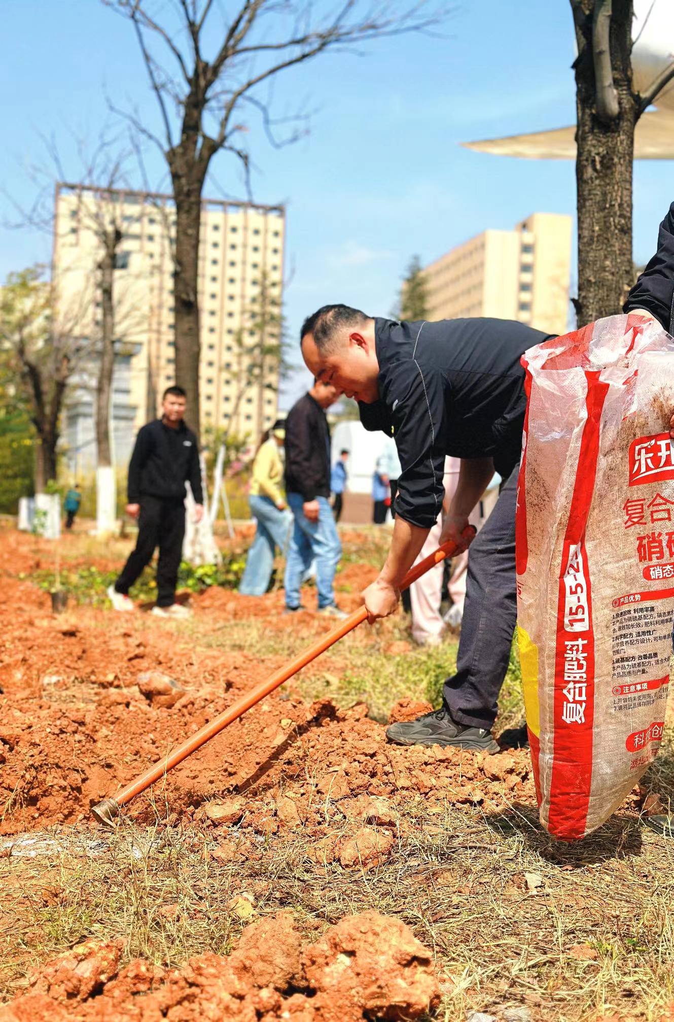 在植树环节,工程与信息学院党支部成员热情高涨,分工协作。有的挥锹铲土,有的扶苗填坑,有的浇水灌溉,现场呈现出一派热火朝天的劳动景象。大家齐心协力,将一棵棵石榴树苗稳稳地植入土中,每一棵树苗都承载着大家对民族团结的美好期许和对校园环境美化的坚定决心。
